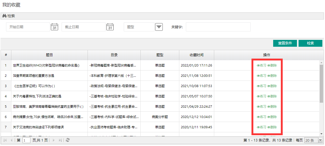 ### 在章节练习页面,点击[收藏]按钮,系统会自动将该题目收藏到我的收藏下边,以便于加强练习,也可用于组卷。  ### 在我的收藏模块中,可查看日常练习中收藏的所有题目。  ### 点进红框中操作按钮,可进行练习或删除收藏的题目。