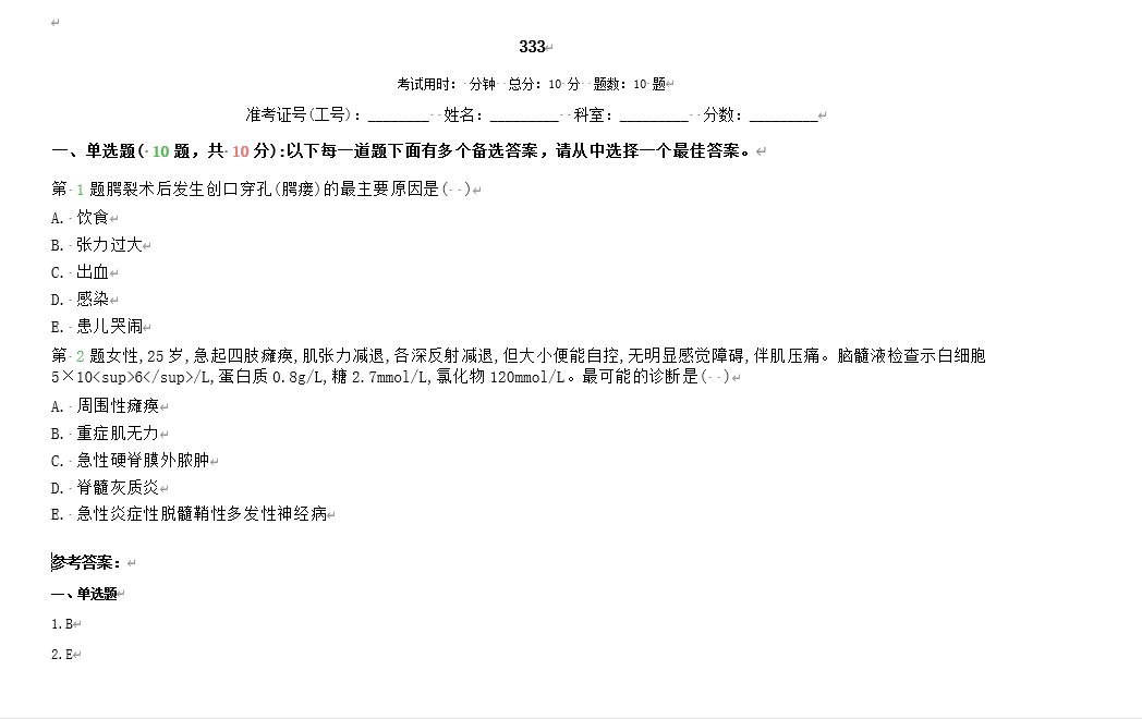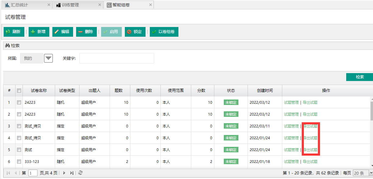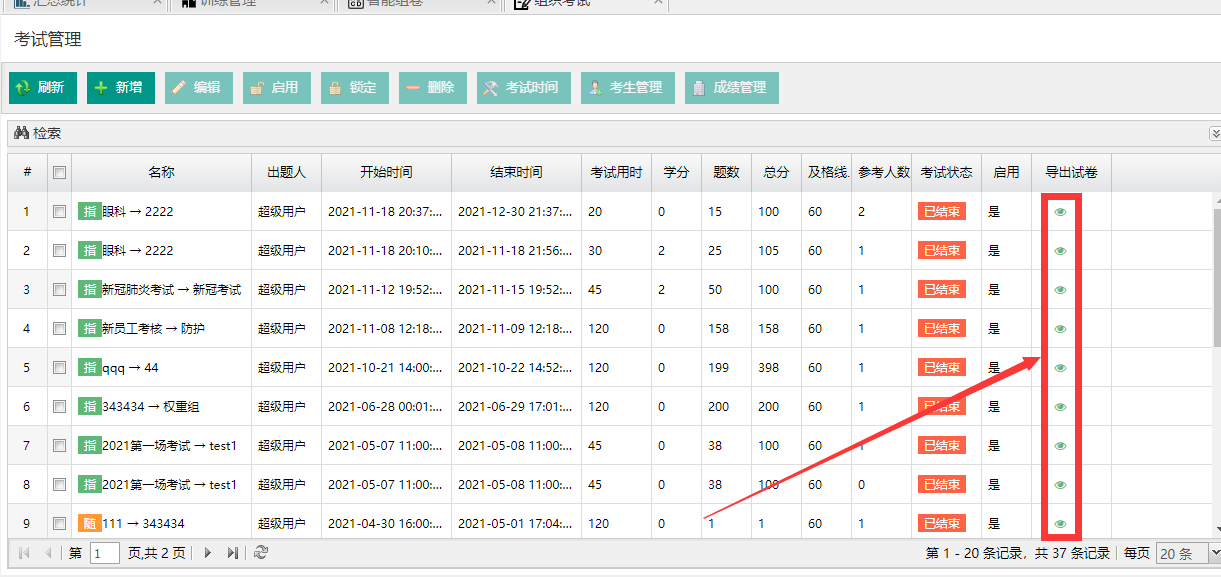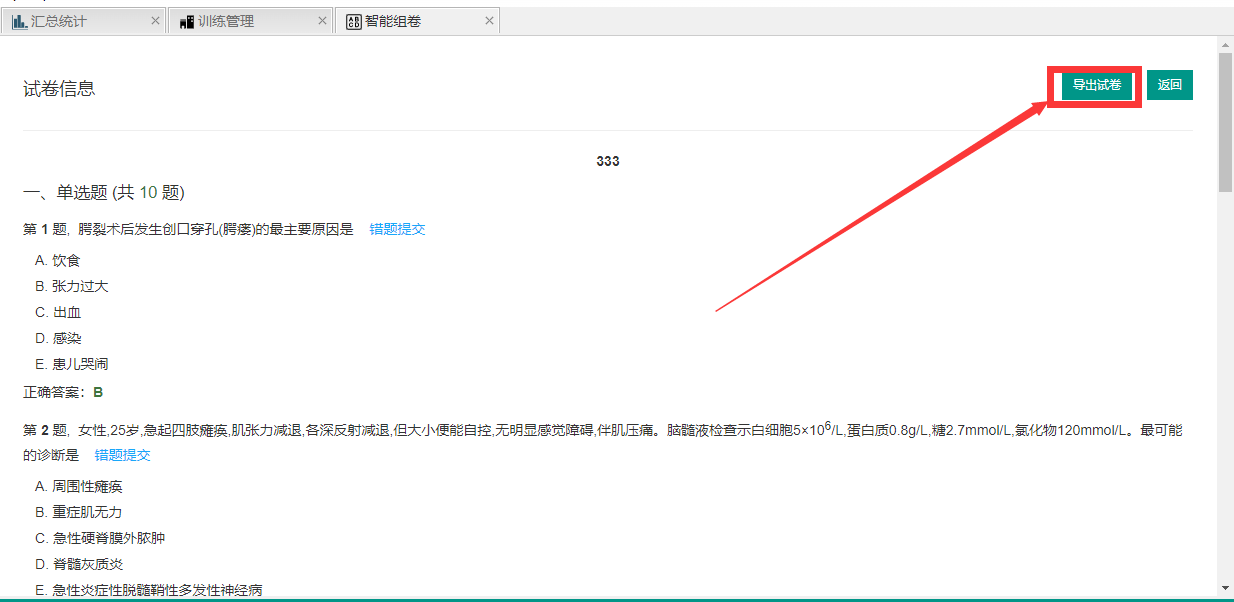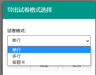 ### 在实际工作中,有时候需要导出Word版本试卷,以便于组织纸质考试。在本系统中,试卷导出功能有两个地方可以实现,导出的试卷均相同,大家可根据实际情况进行选择。但是,试卷导出仅限于指定类型的试卷,随机类型的试卷是无法导出的。 ### 在[试卷管理]菜单下的[智能组卷]菜单下,点击[操作]下边的[导出试题]链接,或[考试管理]菜单下的[组织考试]下导出试卷下边的小眼睛,见下图红圈:   ### 弹出如下界面:  ### 在试卷预览界面,右上角点击[导出试卷]按钮,弹出如下界面:  ### 在试卷格式中选择单行、多行、答题卡三种类型中的一种。单行和多行指的是答题选项在同一行还是每个选项在不同的行,而答题卡是指为本套试卷专门设计的答题界面,里边仅有试题目录,无试题内容。导出试卷时,不同的浏览器,导出来的文件位置不同,需要用户在实际使用过程中进行选择。一般导出后的文件会被放在一个压缩包中,使用时,需解压后使用。导出的试卷,会将标准答案放在试题的后边,以便组织考试使用。标准试卷格式如下: