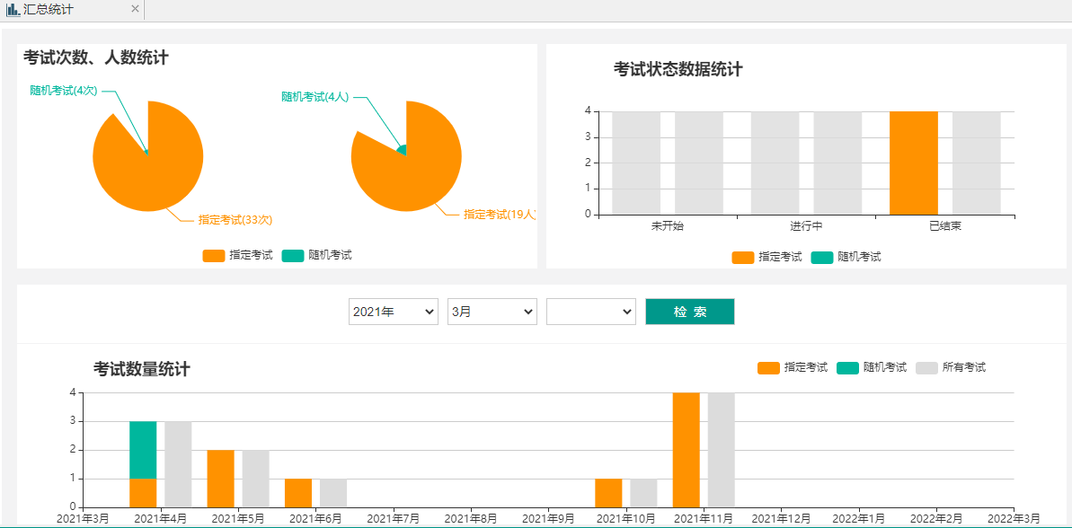 ## 汇总统计功能主要用来统计本院区某时间段内各类考试的汇总数据,并产生相应的考试次数、人数统计、状态数据统计、考试数量统计的柱状图、饼形图等统计图表。方便管理人员对考试信息的统计和分析。