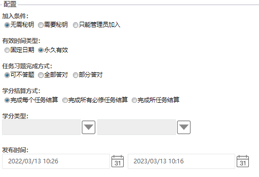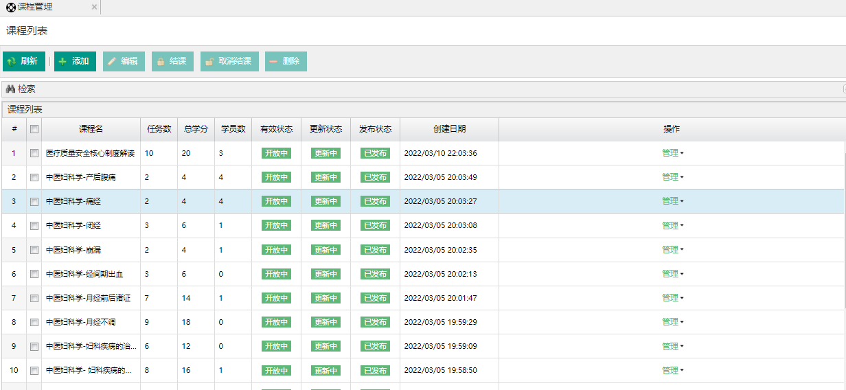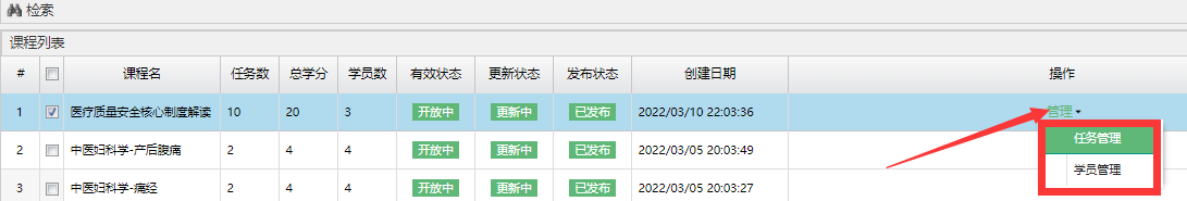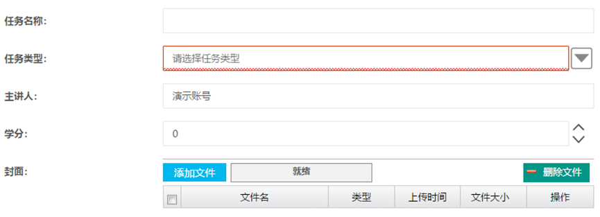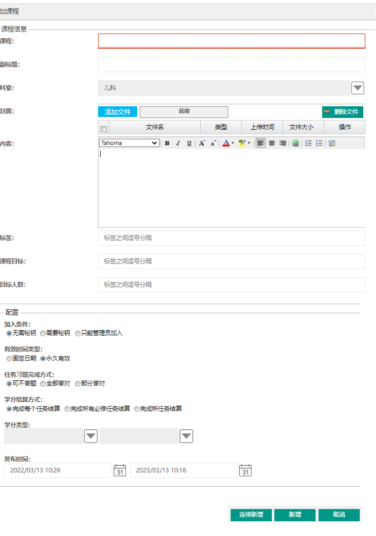 ### 该模块中可将本院自己所需上传的视频、图文、文档或某个试卷作为一个课程,上传到平台中,供医护人员学习,完成后可在进度管理中查看学习进度。  ### 如果需要添加新的课程,则点击工具栏上边的按钮,弹出如下窗口:  ### 输入课程名称,选择规类科室,通过按钮添加课程封面图片,内容、标签等属于选填类型,可根据实际情况填写。在配置窗口中,可设置加入条件,有效时间、任务习题完成方式、学分类型和发布时间等选项,如图:  填写完毕后,点击右下角的按钮,完成课程的添加,然后在列表中点击操作中的任务管理,如下图:  ### 每门课程的后边均可以对课程任务和学员进行管理,见上边画红圈部分。在任务管理中添加课程的具体任务,注意,一个课程中可包括任意多个任务。(课程与任务间的关系,课程相当于生活中的一本书,而任务则相当于书中的每一个章节,任务不能单独存在,必需存在于某个课程当中,而单纯的课程没有任务,则相当于一本空书,是没有任何意义的)。 ### 点击任务列表中工具条上边的按钮,弹出任务添加窗口:  ### 任务类型比较重要,系统分为四种类型,分别为图文、视频、文档,图文类型可直接在内容窗口中粘贴或排版即可; ### 视频需上传MP4格式文件(单文件不能大于100M,如果大于100M则需联系厂商协助上传); ### 文档可以为PDF或DOC、PPT等文件; ### 然后点击右下角的[新增]按钮即可完成上传任务,要注意,是否选修选项比较重要,默认为否,如果定义为选修,则任务需要按顺序编号来学习,不能跳跃。 ### 顺序字段为必填字段,控制每一个任务之间的顺序,主要用来控制必修课,以保证必修课按顺序学完,所以该字段不可以为空。该在任务上传中,封面文件一般不需要上传,只需要上传文件即可。