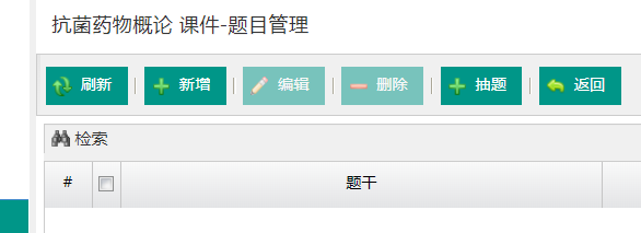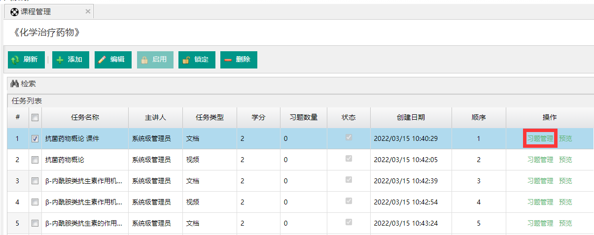 ### 医院自行上传的课程,可以单独设置习题,供学员学习完成后进行复习。习题添加需要在任务创建后,打开管理管理,如下图:  ### 在操作列表中点击[习题管理],弹出习题输入界面:  ### 点击新增按钮,即可进入录入界面:[见题库操作帮助](/project-2/doc-24/ "见题库操作帮助") ### 当然,也可以从系统题库中抽取所需的题目到教程下,点击工具条上边的[抽题]按钮。弹出题库抽取界面,操作见视频:视频