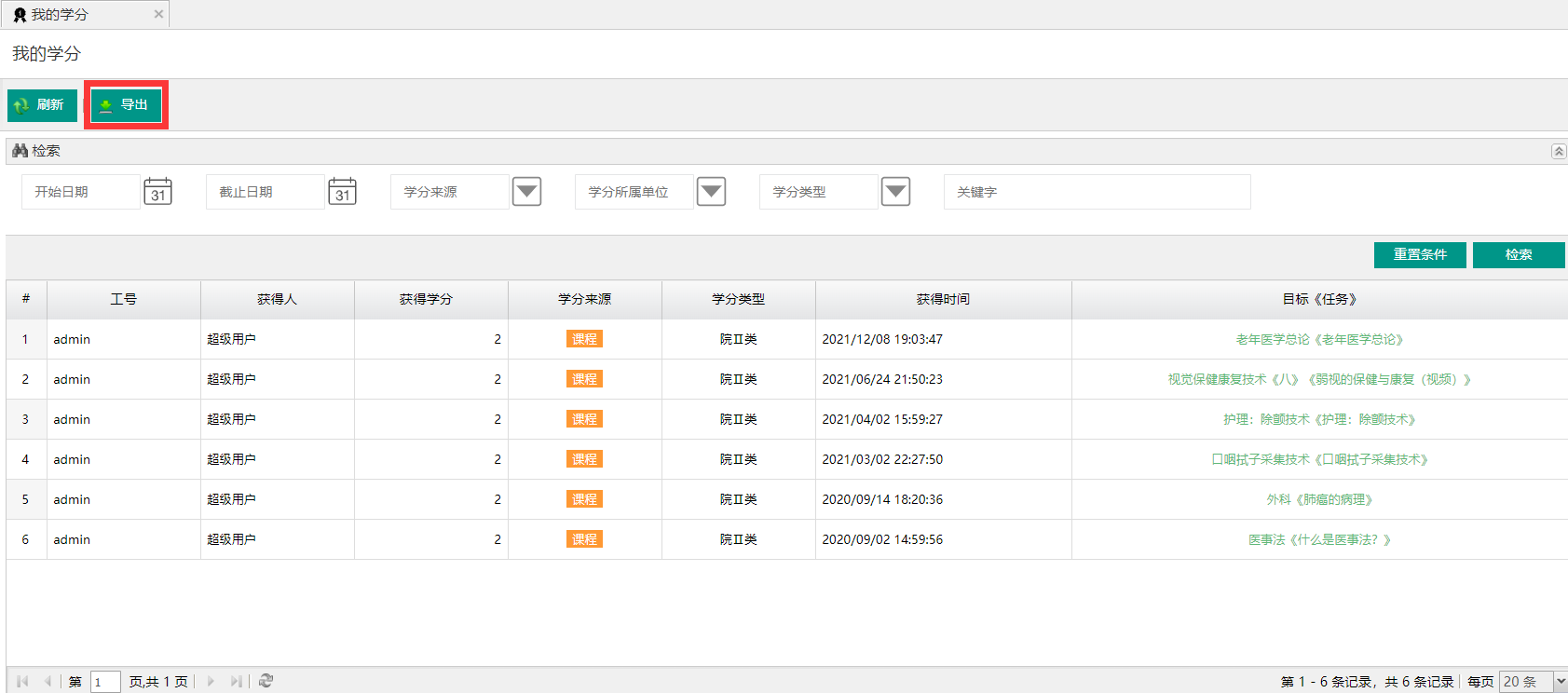 ### 该模块中可查看自己在平中获取到的所有学分,也可以按下工具条上的[导出]按钮,导出Excel表格。 ### 可以在检索条中,按条件进行检索统计。