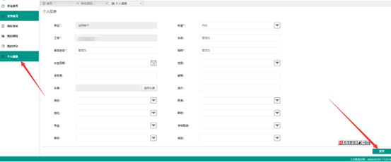 ### 如果当前用户的职务、职称或身份、岗位等信息发生变更时,请即时在系统中变更,以方便管理人员组织考试或管理中使用。点击左边功能菜单区域的[个人信息]菜单进行修改。  ### 除工工号不可以修改以外,其它信息都可以进行修改,也可以点击按钮,上传喜欢的图片作为自己的头像。信息填写完毕后,点击右下角的按钮,完成信息更新。
